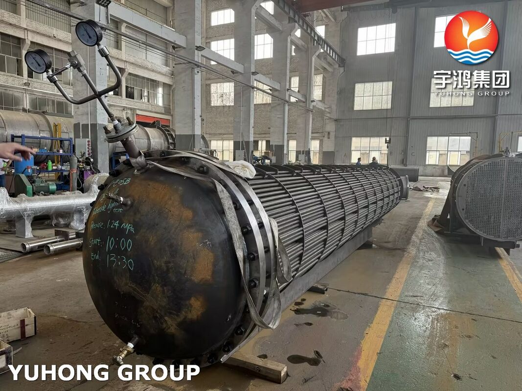 The heat exchanger is built as a TEMA Type AES (externally sealed floating head) design, which is ideal for applications with a large temperature differential between the shell and tubes, allowing for thermal expansion without stress.